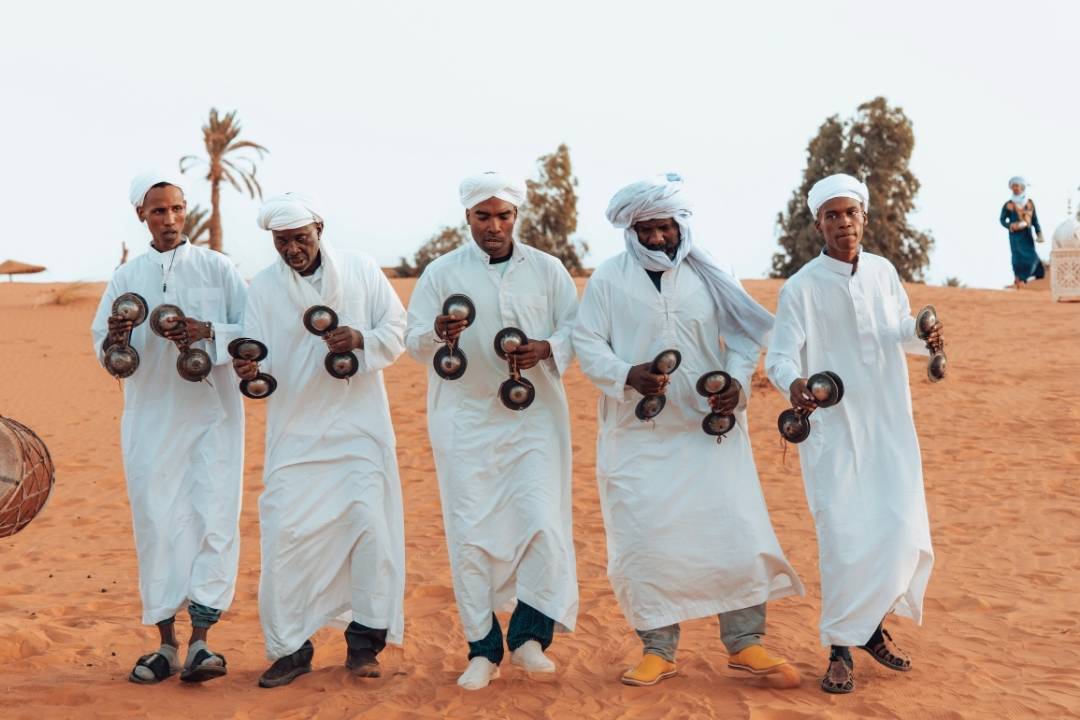 After a delicious Berber breakfast, we will get into the 4×4 to start our tour around the dunes of Erg Chebbi, (desert region with dunes). Among the many stops that await you, we will discover how and where nomadic families live, contemplate spectacular landscapes, and palm groves as well as a stop in a village to enjoy a beautiful concert of Gnawa music, the music of the former black slaves, while sipping a delicious tea.