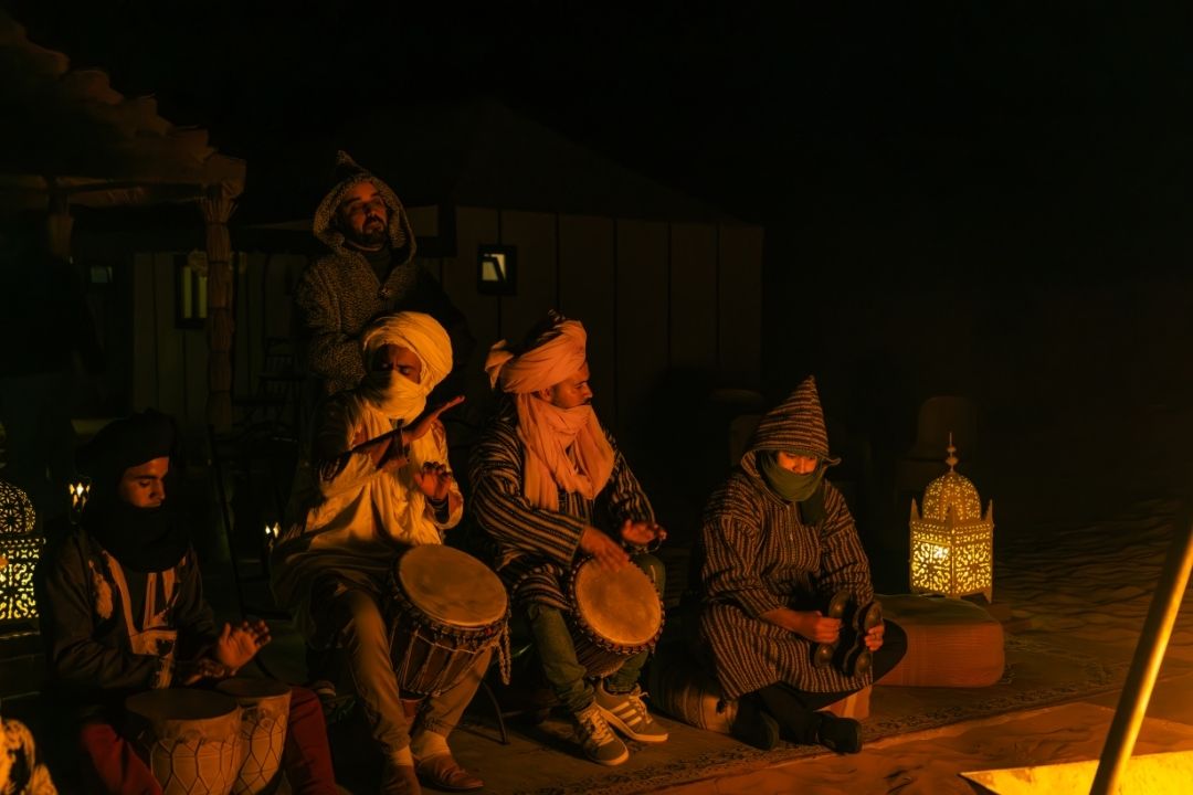 The evening includes a delicious Moroccan dinner, traditional drum music around the campfire, and stargazing under the clear desert sky.
